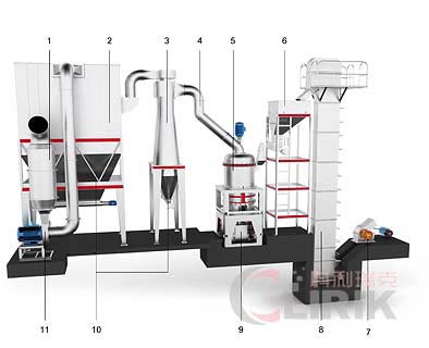 HGM云母磨粉機(超細磨粉機)全套配置包括錘式破碎機、斗式提升機、儲料倉、震動給料機、微粉磨主機、變頻分級機、雙聯(lián)旋風(fēng)集粉器、脈沖除塵系統(tǒng)、高壓風(fēng)機、空氣壓縮機、電器控制系統(tǒng)。